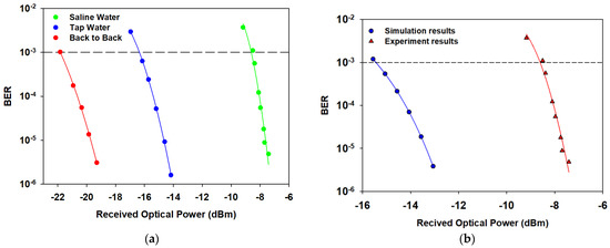 In Figure 4a, we measured the bit error rate (BER) curve of the tap water and seawater at a distance of 1.5 m. Know that, the value of hyphen (-) in the x axis defined as a minus sign from the Sigmaplot software. The explanation is the same for some of the following figures. The back-to-back measurement was measured directly from the LD into the APD without the medium of water. This experiment aimed to find the optical power difference between the tap and seawater to reach the maximum BER. Scattering and absorption in the seawater were significant reasons for the signal attenuation. The forward error correction (FEC) value for underwater communication was around 10−3. In the FEC limit line, the BER value recorded for the back-to-back system was 1.022 × 10−3 at 21.83 dBm (R1Q4). The BER value of tap water at a −16.96 dBm receiving power was 2.97 × 10−3. The BER value of saline water was 3.72 × 10−3 at a −9.18 dBm receiving power. The difference in the receiving power between tap water and sea water at 10−3 was 7.78 dB (R1Q1). The BER measurement of the UWOC system in the seawater needed more optical power than in tap water. However, the BER curve in seawater had a nearly vertical graph, indicating that BER could drift to the worst by only minor changes in optical power. Figure 4b shows the BER comparison between the Optisystem 13 simulation and experimental saline water-based UWOC system measurement. The difference in the receiving power between the experimental and simulation study was 5.65 dB at BER of 3 × 10−6 (R1Q1).