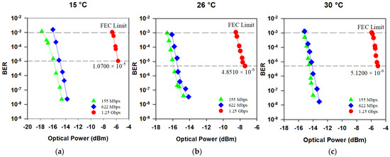 The BER comparison in different temperatures: (a) 15 °C; (b) 26 °C; and (c) 30 °C.