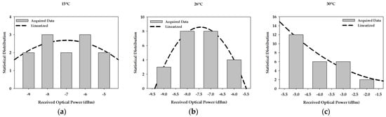Statistical distribution of received optical power due to temperature changes: (a) 15 °C, (b) 26 °C, and (c) 30 °C (R4Q2).