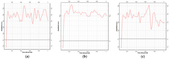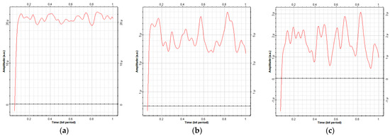 Time (bit period) against received power amplitude due to water flow changes in various water densities: (a) 1.01 density, (b) 1.02 density, and (c) 1.03 density.