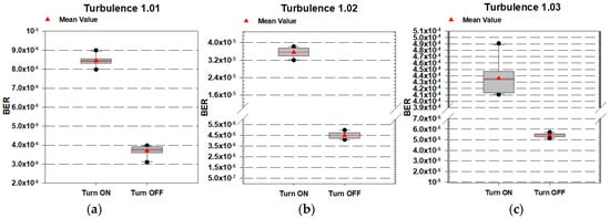 A heater was turned on to reach a specific temperature, as shown in the digital thermometer, for higher temperature measurements. The lower temperature measurement used a cooler fan to generate a wind breeze and an ice pack inside the water. The temperature within the water tank changed automatically based on the temperature measurement tool. We conducted the experiment while the temperature automatically increased to the desired level. The heater and cooler fan made the temperature stable; however, the water temperature was non-uniform. The non-uniform water temperature caused the water to move in a turbulent manner, which was similar to realistic conditions in the ocean. The water tank could have had a temperature variation up to ±2 °C; therefore, the optical attenuation in the water was increased due to non-uniform water refractive indices and non-uniform water temperatures. Each measurement was taken under the same environmental factors, and different data rates resulted in different BERs. Therefore, the data rate caused signal distortion as higher speeds led to faster modulation. In this experiment, we used data rates of 155 Mbps, 622 Mbps, and 1.25 Gbps.
