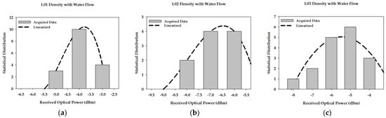 Statistical distribution of received signal amplitude due to water flow changes in various water densities: (a) 1.01 density, (b) 1.02 density, and (c) 1.03 density (R4Q2).