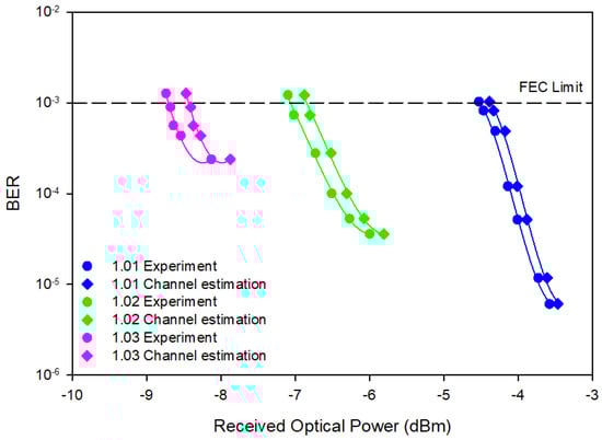 As shown in Figure 8, in 22.78 g/L saline water, the best BER of 8 × 10−6 was obtained when the motor pump was turned on, and the best BER of 3 × 10−6 was obtained when turning off the motor pump. In 37.96 g/L saline water, the BER reached 3 × 10−5 and 4 × 10−6, respectively, when turning the motor pump on and off. Moreover, as the hydrometer scale increased to 1.03, or in the 45.56 g/L saline water, smaller floating particles caused different refractive indexes. When turning it on and off, the motor pump drifted into 4 × 10−4 and 5 × 10−6, respectively. The seawater salinity contributed to the UWOC system attenuation and degraded the signal. Figure 9 shows the statistical distribution of the received optical power due to the water flow changes in various water densities. Figure 10 shows the time (bit period) against the received power amplitude due to water flow changes in various water densities of 1.01, 1.02, and 1.03. As water salinity increased simultaneously with the water flow, the channel coherence time of the amplitude signal had more fluctuations in the 0.2 to 1-bit period. As the salinity increased, the signal distribution became large, indicating the signal fading condition. Figure 11 shows the channel estimation for each water flow measurement.