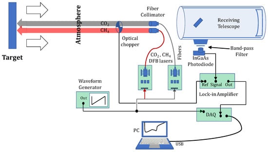 Optical spectroscopy techniques possess high sensitivity, good selectivity, and continuous, real-time detection [6,7,8]. Open-path optical spectroscopy techniques such as Fourier-transform infrared (FTIR) spectroscopy and differential optical absorption spectroscopy (DOAS) have been employed to measure trace gas column concentrations. Several research groups have developed FTIR and DOAS systems for measuring column concentrations of various trace gases simultaneously, using sunlight (passive), lamps, or LEDs (active) as the light source [9,10,11,12]. However, the broadband light source has a low spectral resolution, which limits gas detection sensitivity.