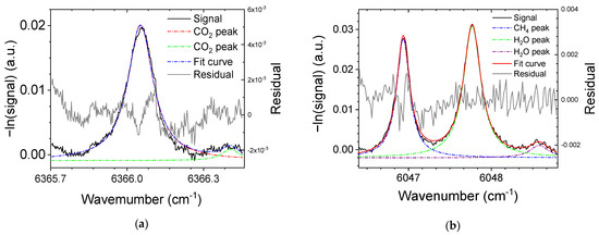 Typical (a) CO2 signal, fitted function, and the residual between the fitted profile and the CO2 signal; and (b) CH4 and H2O signal, fitted functions, and the residual between the fitted profile and the CH4 signal.