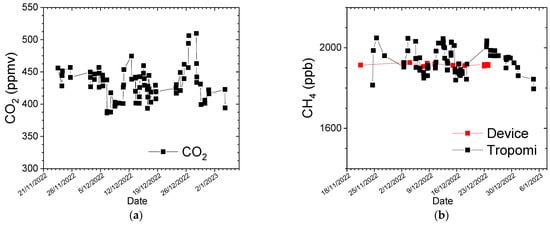 Concentration variation in (a) CO2 and (b) CH4 in the atmosphere from 24 November 2022 to 4 January 2023.
