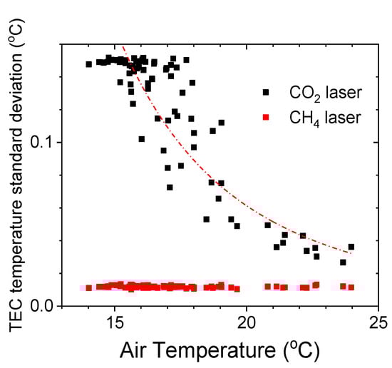 However, the measured atmospheric CO2 content variation is noticeably higher than that reported in our recent work (Figure 9a), which is attributed to the lower atmospheric temperatures during the remote operation of the device compared with the summer season measurements. Low atmospheric temperature affects the performance of the thermoelectric cooling (TEC) driver of the CO2 laser. In particular, the TEC is ineffective in stabilizing the temperature of the laser (Figure 10). The laser temperature instability changes the wavelength of the laser and affects the recorded signal, which causes a broadening of the CO2 absorption peak. Even though the CO2 laser suffers from TEC stability in lower air temperatures, the CH4 laser temperature remains stable at all temperatures due to the lower electric current required for CH4 laser operation than the CO2 laser. The lower current produces a smaller thermal load, which is easily compensated by the TEC module. In any case, a future upgrade of the device is necessary to enhance the laser driver’s thermal insulation, enabling it to operate effectively at lower temperatures without compromising the performance of the TEC driver.