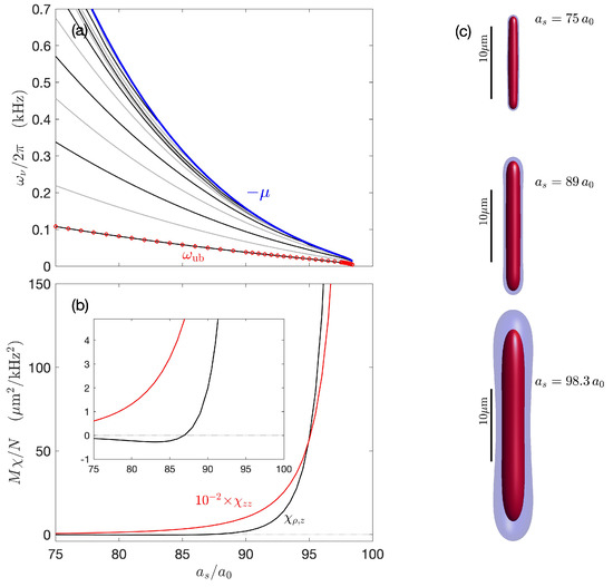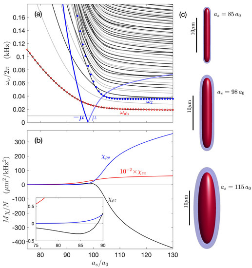 In Figure 1c we show the results for the static polarizabilities. The axial result [used in Equation (15)] is always positive, reflecting that the application of a weak axial confinement to the free-space droplet causes it to shorten. The magnitude of tends to be much larger than , so we scale it by a factor of to make the two polarizabilities easier to compare. The transverse response changes sign depending on the atom number. In the deeply bound droplet regime (i.e., for , where is large and negative), it is negative. Thus, a weak compression along z results in the droplet expanding transversally. In contrast, closer to the unbinding threshold (), is positive, and the transverse width decreases with axial compression. This occurs as the lowest mode starts to soften. This change in behavior of the transverse response occurs as the lowest excitation mode changes from quadrupolar character at high N to monopole (compressional) character at low N [17].