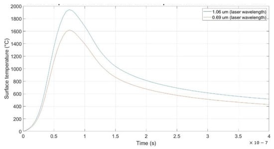 where is the thermal diffusivity, is the thermal conductivity, is the radiation intensity of the incident laser beam in function of time, and the integration variable , is the initial temperature. The surface temperature equation is calculated for each wavelength using the following parameters: For , k = 53.7 W/(m·K), , T0 = 20 °C, R = 0.75, and for R = 0.68, and are shown in Figure 3. Note that the maximum surface temperatures are 1945 °C and 1618 °C for wavelengths and , respectively.