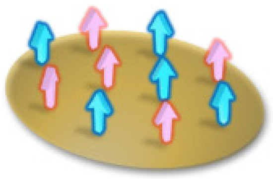 Schematic diagram of the 2D binary dipolar system plane, with all the dipoles oriented perpendicular to the 2D plane. The two types of arrows with different colors (pink and blue) represent the two components of dipolar atoms in the mixture.