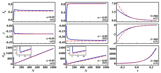 The first column (a1–a3): the peak density (), chemical potential (), effective area () of the fundamental QDs as functions of N for repulsive DDIs with . The second column (b1–b3): the , , and of the fundamental QDs as functions of N for attractive DDIs with −. The last column (c1–c3): the , , and of the fundamental QDs as functions of the strength of with . Here, the blue curves are the results of the numerical calculation, and the red dashed curves in the panels are calculated from Equations (13), (14), and (15), respectively.