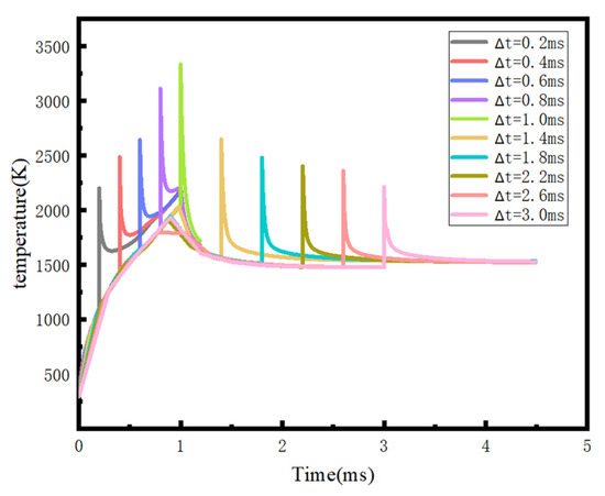 When the energy density of the millisecond pulsed laser is 800 J/cm2 and the energy density of the nanosecond pulsed laser is 20 J/cm2, the simulation results of the temperature of fused quartz center irradiated by combined pulsed lasers with different pulse delays are shown in Figure 2. When the nanosecond pulse laser is used, the temperature at the center of the fused quartz shows a sharp rise. With the change in ∆t, the peak temperature is constantly changing. Due to the high peak power density of the nanosecond pulse laser, the target is vaporized and ionized to form a plasma under the irradiation of the nanosecond pulse laser. The plasma completely absorbs the laser energy and leaves the target. In addition, the temperature evolution induced by the nanosecond pulsed laser lasts only about 30 μs. When 0 ms < ∆t ≤ 1 ms, the nanosecond pulse laser acts in the early stage of millisecond pulse laser irradiation, and the pre-irradiation of the millisecond pulse laser has relatively little effect on the temperature rise of the nanosecond pulse laser irradiated target. When 1 ms < ∆t ≤ 3 ms, the nanosecond pulsed laser acts after the millisecond laser stops irradiation. It can be seen that the effect of the nanosecond pulse laser slows down the temperature, and the temperature drops rapidly to a slightly higher temperature than that before the action after the end of the nanosecond laser action. Due to the low power of the millisecond pulse laser, the fused quartz does not reach the melting point (2123 K) and does not produce plasma, but plays a preheating role, which makes it easy to make plasma under the action of the subsequent nanosecond laser.