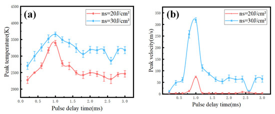 Variation in peak temperature and plasma peak velocity of fused quartz with pulse delay. (a) The variation in peak temperature pulse delay of fused quartz; (b) the variation in plasma peak velocity with pulse delay.