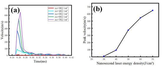 The variation in plasma expansion velocity under different nanosecond laser energy: (a) the relationship of plasma expansion velocity with time; (b) the relationship between plasma peak velocity and nanosecond energy density.