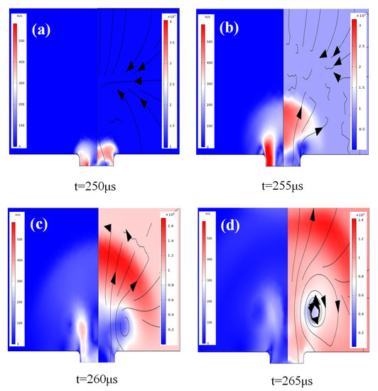 Velocity and pressure fields of plasma and absorbing waves (velocity field on the left and pressure field on the right): (a) t = 250 μs; (b) t = 255 μs; (c) t = 260 μs; (d) t = 265 μs.