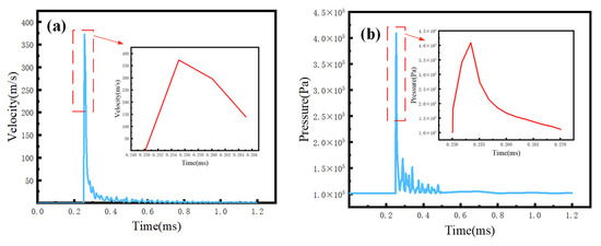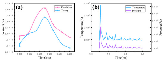 According to Equation (24), the variation in wavefront pressure with time is calculated as shown in Figure 8a. The simulation results are in good agreement with the theoretical results, which reach the peak at 255 μs, where γ = 1.2 and = 1.29 kg/m3. According to Equations (25) and (26), the relationship between the wavefront temperature and pressure is proportional, and the relationship between the wavefront temperature and time is calculated as shown in Figure 8b. The variation trend of the wavefront temperature is consistent with time, and the peak temperature is about 3.81 × 104 K at 255 μs.