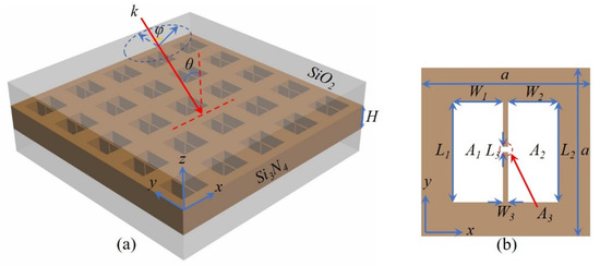 (a) three-dimensional schematic diagram of dielectric metasurface with H-shaped nanoholes surrounded by SiO2; (b) x-y cross-section of the nanohole array in a lattice.