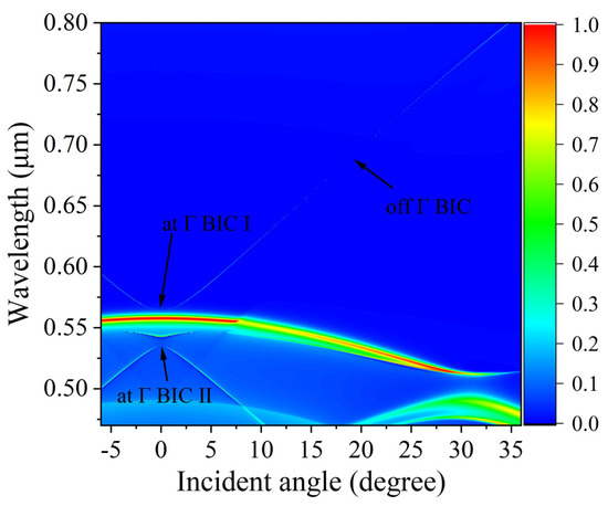Furtherly, we move the center location of part A1 in y direction by 0.05 μm, and the center location of part A3 in −y direction by 0.05 μm, in the H-shaped nanoholes in order to study the influence of symmetry of the nanohole in the BICs, as shown in Figure 9. It is seen distinctly that the two BICs at Γ point disappear; however, the BIC at the oblique incident angle is affected insignificantly. We can modulate the presence of at Γ BICs only by adjusting the relative position of the parts in the nanoholes.