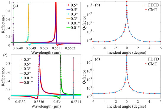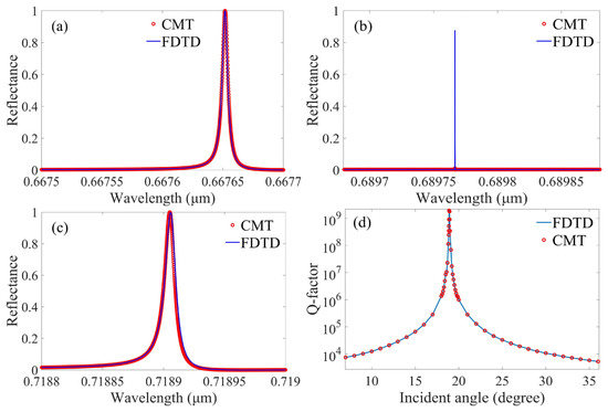 Above all, the Q-factors in Figure 3a,c tend to infinity at incident angle 0°, indicating two ideal BICs at the Γ points and that in Figure 4, they display a ultrahigh value at about 18.9°, revealing one ideal BIC at an off Γ point. The infinite Q-factor means that resonance has an infinite lifetime and the leakage resonance becomes a local eigenmode, which is perfectly limited. However, due to the surface roughness and material absorption, as well as the limited size of the sample, the Q-factor cannot reach the theoretical level. In Figure 3 and Figure 4, we simulate the reflectance spectra and Q-factors using the CMT method to confirm that from FDTD and the results from both methods accord well. Here, the various parameters are shown in Table 1.