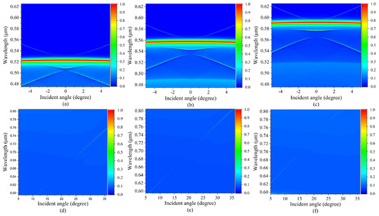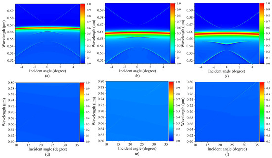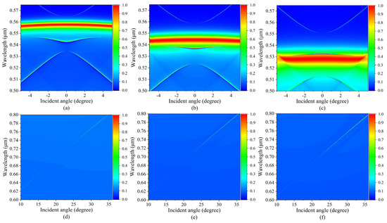 BICs are robust when system parameter changes occur, as shown in Figure 6. Consequently, we simulate the reflectance of the photonic crystal slab with the H-shaped nanohole array as the lattice constant changes to a = 0.316 μm, 0.336 μm, and 0.356 μm at Γ points and off Γ points, respectively. Figure 6a shows that two BICs located at Γ point at 0.50408 μm and 0.531757 μm in the reflectance spectra. As the lattice constant increases from 0.316 μm to 0.356 μm, the center wavelength of the two BICs redshifts obviously to 0.564374 μm and 0.596559 μm, with the distance between the two BICs widening from 0.060294 μm to 0.064802 μm as shown in Figure 6c. The results here are helpful in the design of optical devices based on multi-BICs. On the other hand, variation in the BIC at the off Γ point is simulated in Figure 6d–f as the lattice constant increases. The off Γ BIC happens at 18.7° and 0.64648 μm with a = 0.316 μm, and it occurs at 18.8° and 0.728704 μm with a = 0.356 μm, which means the lattice constant can modulate the incident angle and wavelength where the off Γ BIC appears.