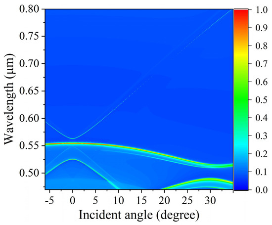 Figure 2 is the numerical reflectance spectra of the photonic crystal slab with an H-shaped nanohole array under a p-polarized plane wave. Two BICs at a normal incidence and one BIC at an oblique incidence are obtained in the picture. The former is the symmetry-protected BIC, which is associated with the coupling prohibition with the outgoing waves due to symmetry incompatibility, and the latter is the accidental BIC, which is attributed to the leakage canceled by interference [43]. The two symmetry-protected BICs happen at λ = 0.5647652 μm and 0.5343390 μm, respectively, with incident angle θ = 0°, and the accidental BIC occurs at λ = 0.6890324 μm with incident angle θ = 18.9°. These multiple BICs move as the structural parameters vary, in other words, they can be modulated flexibly by the parameters.