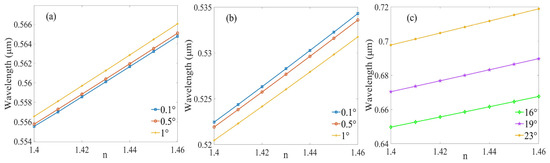 Figure 10 shows the center wavelength of the resonance modes as a function of the refractive index n2 of the surrounding medium for around (a) at Γ BIC I and (b) at Γ BIC II at incident angles 0.1°, 0.5°, and 1°, respectively, and (c) around off Γ BIC at incident angles 16°, 19°, and 23°, respectively. It is shown in Figure 10a that center wavelength of the resonance modes redshift obviously with n2 by a tiny increase. This is similarly shown in Figure 10b; however, at the same refractive index of the surrounding medium, the longer the center wavelength, the bigger the oblique incident angle is, which is opposite to what is shown in Figure 10a.