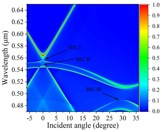 Furthermore, we approach the reflectance spectra of the H-shaped nanohole array structure under the s-polarized plane wave. In Figure 11, we can see that there are two BICs located at Γ point, which we distinguish as BIC I and BIC II. These exhibit different phenomena when illuminated by p-polarized incident light. Additionally, we discovered the emergence of BIC III below BIC II, which is a very peculiar phenomenon. This could potentially lead to different research directions for the study of s-polarized light. On the other hand, when considering wavelength band, BIC under oblique incidence is also observed.