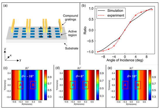 We will illustrate the idea using finite-difference time-domain (FDTD) simulations (Figure 1c,e) [27]. In the normal direction, the light energy shows a symmetrical distribution. When the incident light tilts at a certain angle, the light energy will be more concentrated on one side, rather than symmetrically distributed. The energy distribution can be detected by placing two photodetectors directly after the gratings. Then, the energy can be calculated by , where is the electric field intensity and is the area of the active regions of the pixels.