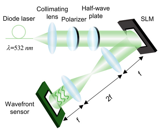 The experiment setup is presented in Figure 4. Light from a laser (Thorlabs DJ532-10) emitting at 532 nm was collimated with a lens. The diameter of the laser beam was 20 mm. The collimated light passed through a polarizer and a half-wave plate to make the beam’s polarization direction parallel to the long axis of the SLM. The SLM reflected the light, which traveled through a 4f system formed by two lenses with a 60 mm focal length. Finally, the light was projected onto our wavefront sensor. The SLM (Holoeye PLUTO-2.1-NIR-134, , pixels) was used to generate a certain phase distribution.