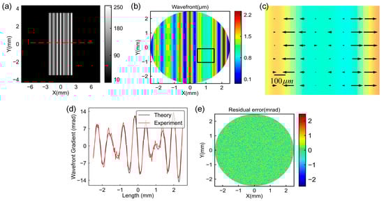 Characterization of the wavefront sensor. (a) Intensity image captured by the wavefront sensor. (b) Wavefront of the plano-convex cylindrical lens reconstructed using Zernike polynomials. (c) Enlarged image of the content in the black rectangle of Figure 3. The arrows represent the gradient information of the wavefront. (d) Profiles of the wavefront gradients along the center of the intensity image. The red circles represent the experimentally measured gradients and the solid black line represents the theoretical values. (e) Residual error map for measured wavefront gradients.