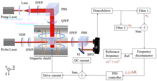 Figure 1 provides the schematic of a Xe isotope comagnetometer. The vapor cell with a 3 mm inner-side length is heated to 120 C by two homemade polyimide heaters, filled with 5 Torr Xe, 20 Torr Xe, 20 Torr , 200 Torr , and a small drop of Rb. A three-dimensional Helmholtz coil designed in our system produces uniform magnetic fields and compensates for the residual magnetism. The static magnetic field along the z-axis is generated using an ultra-low noise current source whose noise density is 4 nA/ (Stanford Research Systems CS580). The magnetic shield is set up outside the coils to weaken the effect of an external magnetic field. The pump beam with the frequency at the Rb D1 line first passes through the lens to acquire a 2.5 mm diameter. By rotating the half-wave plate, the intensity of the pump beam after the polarized beam splitter is set to 2 mW and linear polarization is ensured. A quarter-wave plate establishes the pump beam at a circular polarization to optically pump the alkali metal atoms. By using a neutral density filter, the probe beam is adjusted to 1 mW. The pump and probe laser are both emitted by the same type of DBR laser diodes (Photodigm PH795DBR080TS) and are driven by the circuit produced by UniQuanta. Passing through the vapor cell, the probe beam is separated into two mutually perpendicular linearly polarized beams using a polarized beam splitter. The signal of the comagnetometer is obtained by a balanced photodetector (Thorlabs PDA015A) and is processed in a lock-in amplifier (Zurich Instruments HF2LI). The concrete operation process can be accomplished in PC software (LabOne), which is applied by Zurich Instruments. As a result of the demodulation and filtering of the original signal from the balanced photodetector, the real-time Larmor frequencies of Xe isotopes can be obtained. The nuclear response curves can be measured by sweeping the frequency of the oscillating magnetic field along the x-axis. The resonant frequency is the Larmor frequency of the Xe isotope. The sum frequency (+) is regarded as the reference frequency. By comparing the real-time frequency and the reference frequency, the frequency discriminator calculates the difference between them and inputs it into the PID controller. It is necessary to ensure that the real-time output frequency of the nucleus is equal to the set value. The driving current consists of the output signal of the PID controller and the DC current input to the z-axis coil to control the static magnetic field.