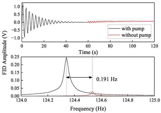 To assess the magnitude of the equivalent magnetic noise, the electron spin polarization is measured by the nuclear frequency shift , which is widely used in the spin–exchange optical pumping system [14,15,29]. The equivalent magnetic field produced by electron spin polarization can be calculated by . Firstly, the alkali metal atoms are pumped by a circularly polarized beam. A /2 pulsed magnetic field is applied along the x-axis to drive the Xe precession and the coherence decays naturally. Then, the pump beam is blocked before the next /2 pulsed magnetic field is applied. An example set for free induction decay (FID) signal and its Fast Fourier Transform (FFT) is shown in Figure 2. The black line is measured with the optical pump condition, and the red line is without the laser irradiation. The nuclear frequency shift is 0.191 Hz corresponding to a 16.1 nT equivalent magnetic field.