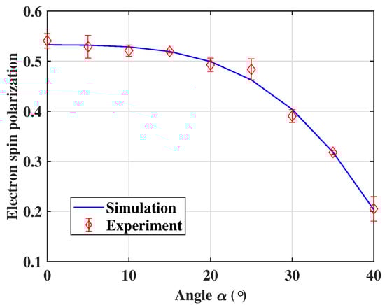 Comparison of the experimental results with simulations of the electron spin polarization in different ellipticity. The error bars represent the maximum and minimum values in the repeated experiments.