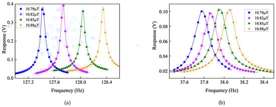 In the following, we study the suppression of the equivalent magnetic noise by controlling the static magnetic field. The reference frequency is acquired from the analysis of the frequency response for different magnitudes of the static magnetic field as shown in Figure 4. The magnetic linewidth is the transverse relaxation rate that consists of the relaxation in alkali metal collisions, the relaxation due to collisions with the cell wall surface, the relaxation due to magnetic-field inhomogeneities, and the gas-phase relaxation due to the self-collisions of the noble gas atoms [30,31]. Each of the blue, pink, green, and yellow dots and lines corresponds to the static magnetic field at 10.79 T, 10.82 T, 10.85 T, and 10.88 T. Figure 4a shows that the Larmor precession frequency of Xe changes from 127.430 Hz to 128.483 Hz. Likewise, the Larmor precession frequency of Xe changes proportionally, as shown in Figure 4b. With the increasing magnitude of the static magnetic field, the Larmor frequency of Xe isotopes rises, which is consistent with Equations (5) and (6).