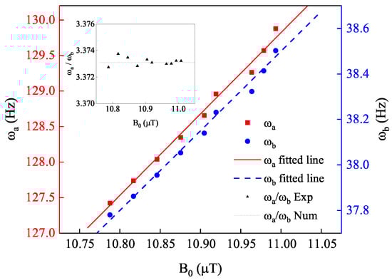 To further verify the linear relationship described in Equations (5) and (6), the Larmor frequencies of the Xe isotopes are measured at a series of static magnetic fields, as shown in Figure 5. The coefficient of determining the R-Square of the Xe isotopes’ experimental data are both larger than 98.6%, which describes a good linearity of the static magnetic field and the Larmor frequency of the Xe isotopes. The inset figure represents the ratio of the two frequencies under different magnitudes of the static magnetic field. The ratio is a constant when the equivalent magnetic noises equal to zero. When the equivalent magnetic noise cannot be ignored, the ratio tends to maintain a steady level with the growing of , thus indicating the synchronization and stability of the inertial information in the Xe isotope measurements.