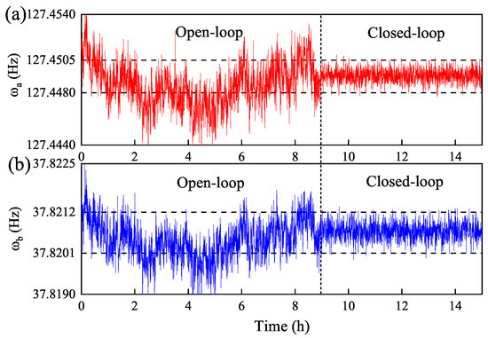 Experimental performance of the Xe isotopes under open-loop control and closed-loop control. (a) relates to Xe, while (b) relates to Xe. The frequencies of the Xe isotopes are measured simultaneously. The horizontal dashed lines indicate the noise level of the closed-loop control.