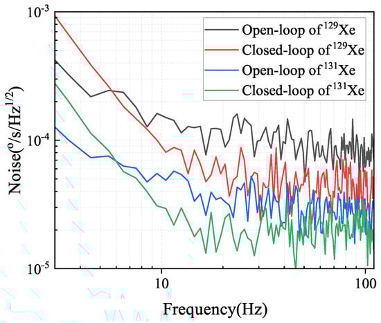 The real-time Larmor frequencies of Xe isotopes in the static magnetic field of open-loop control and closed-loop control are measured over 15 h, as shown in Figure 6. The open-loop control is conducted in the first 9 h, in which the range of frequency fluctuations of Xe and Xe, due to the equivalent magnetic noise, is 0.01 Hz and 0.0035 Hz, respectively. The closed-loop control conducted in the last 6 h is applied to suppress the long-term drift caused by this noise. The variation in the frequency fluctuations of Xe and Xe are 0.0025 Hz and 0.0011 Hz, respectively, reduced by 75% and 68.6%. This notably reduces the interference of the noise and improves the stability of the Xe isotope comagnetometer. A greater enhancement of the noise suppression effect is restricted by magnetic field gradient produced by inhomogeneous electron spin polarization and errors introduced by signal processing. Figure 7 shows the signal noise measurement results of the Xe isotope comagnetometer under the same conditions of Figure 6. According to the experimental test results, the signal noise of the co-magnetometer in closed-loop control is lower than it in the open-loop control. Both frequencies of Xe and Xe have better performance under the closed-loop control. The noise level of Xe is greater than Xe because of the larger gyromagnetic ratio.