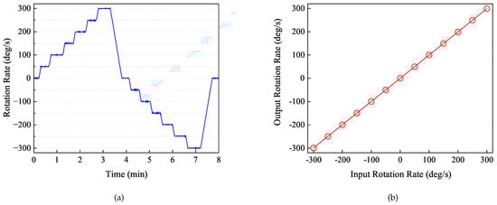 The input rotation rate changes from 300 /s to −300 /s at a step of 50 /s, and Figure 8a shows the absolute frequency measured using the comagnetometer with the sampling rate at 200 Hz. The output frequencies calculated according to the standard that the method in each rotation rate (circle) are compared with the input signal (line), which can be seen in Figure 8b. The scale factor is 0.997. Thereby, our method to suppress the equivalent magnetic noise caused by electron spin polarization has realized a groundbreaking compromise between the stability and bandwidth.