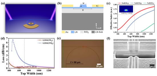 Design of the microring resonator. (a) Device diagram, showing the optical fiber, grating coupler, microring resonator and electrodes. (b) Waveguide design of microring resonator. (c) Effective refractive index of waveguide modes at different top widths; the inset shows the mode of the waveguide at 1550 nm. (d) Losses of mode and mode for different top widths. (e) A partial SEM image of the microring resonator; the figure contains part of the line waveguide and the ring waveguide and the radius of the microring resonator is 90 m. (f) SEM cross-sectional image of the microring resonator coupling region, corresponding to the region in the red dashed box in (e).