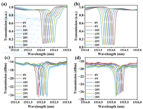 The modulation efficiency, which is the shift in the resonant wavelength when a certain voltage is applied, is the metric used to evaluate the performance of the microring modulator. The device structure shown in this paper was used for direct current (DC) electro-optical modulation by applying voltage to the device using a probe at the electrode. When a voltage is applied, the effective refractive index of the LN material changes and the alteration in the refractive index changes the effective optical range length of the resonator, resulting in a frequency shift of the resonance. A wavelength shift of the resonance with voltage is observed by sequentially adding the DC voltage from 0 V to +30 V and then reversing the voltage from 0 V to –30 V. The results of the experimental observations are shown in Figure 3c,d. The resonant wavelength exhibits a bathochromic shift following the addition of a DC positive voltage, whereas it exhibits a hypsochromic shift following the addition of a DC negative voltage.
