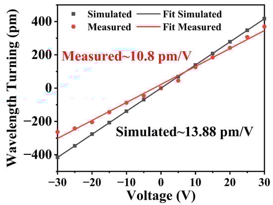 According to the fitting shown in Figure 4, the measured average voltage modulation efficiency is 10.8 pm/V. The turning efficiency of the voltage reaches 13 pm/V when a positive voltage of 25 V to 30 V is applied to the device, which is slightly higher than the average voltage modulation efficiency. In contrast, when a negative voltage of –25 V to –30 V is applied, the turning efficiency is 4.2 pm/V, demonstrating the asymmetry between the positive and negative voltage modulation. The hypsochromic/bathochromic shift of the resonant wavelength persisted for a period of time after the DC bias voltage was removed. The difference in the degree of influence of the positive and negative voltages on the resonant wavelength shift was measured experimentally and the Maxwell–Wagner effect [27,37] found in the device was analyzed. That is, the asymmetry of the resonant wavelength shift under the influence of the static EO effect is due to the interfacial polarization phenomenon caused by the charge accumulation between the interface of the LN waveguide and the air cladding. Figure 3a,b, which are the results of the simulation, show the effects of the positive and negative voltage modulation of the device, respectively. Figure 4 is fitted with the modulation efficiency, which is 13.88 pm/V, which is compatible with our experimental results. Comparing the microring modulator based on LNOI or LN hybrid platforms to the other studies in Table 1, our modulator performs better than the other devices in terms of the compromise between chip size and modulation efficiency.