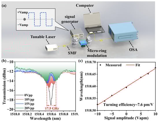 To study the impact of the resonant wavelength shift of the device under the modulation of square-wave signals of different amplitudes, a 1 KHz square wave signal was added to the device. Figure 5a depicts the experimental setup and the electrodes of the chip are loaded with a square-wave signal from the signal generator (SIGLMENT SDG2082X). Because the frequency of the added square wave-signal is much faster than the wavelength scan, two stable resonances appear at each square-wave signal of different pulse amplitudes, leading to retention effects in the spectrum, as shown in Figure 5b, where the two stable resonances are distributed on the left and right of the resonant wavelength, corresponding to the positive and negative voltages applied to the device. The resonant wavelength tunable bandwidth of the device can reach 17.5 GHz at a low pulse signal of 20 Vpp. Furthermore, as shown in Figure 5c, the square wave signal modulation results are fitted and an alternating current (AC) modulation efficiency of approximately 7.6 pm/V is obtained. This is consistent with our preconceived results that AC modulation efficiency is lower than the static voltage modulation efficiency.