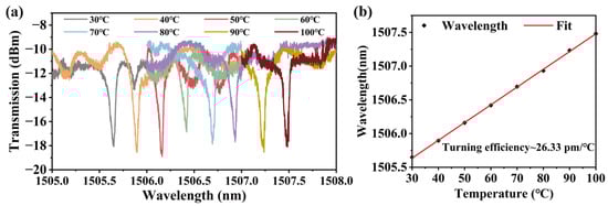 Because the modulation of the device is affected by temperature [42,43,44], we also verified the sensitivity of the device to ambient temperature. The device was heated at room temperature by placing a metal ceramic heater at the bottom of the chip from 30 C to 100 C and observing the spectrum at the light-emitting port. Figure 6a shows the wavelength shift results of the microring resonator after temperature modulation. It is experimentally shown that the resonant wavelength of the microring resonator is bathochromically shifted after every 10 C temperature increase. Figure 6b shows the fitted wavelength shift efficiency, with a resulting temperature modulation efficiency of 26.33 pm/C while producing almost no additional optical transmission loss. The chip can be adjusted for better efficiency and can accommodate a larger tunable range in the future under varied environmental sensitivity settings if it is co-modulated with voltage modulation and temperature modulation.