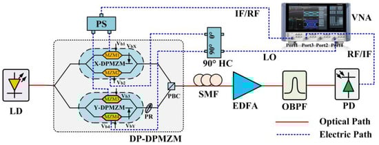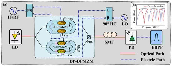 In the DAA-based radar system, frequency mixing and phase shift are two critical signal-processing functions, which are generally achieved by using independent electronic components such as mixers and phase shifters. The greatest limitation of the electrical solution is its small octave. In order to solve this problem, various broadband microwave photonic mixers with the ability to achieve full-range phase tuning have been proposed and demonstrated in recent years [3,4,5,6,7,8,9,10]. These schemes can be divided into two categories. The first category realizes the functions of the frequency mixing and the phase shift by employing separate hardware. In these schemes, the intermediate-frequency (IF)/radiofrequency (RF) signal and the local oscillation (LO) signal are loaded onto two orthogonally polarized light, respectively, by using a polarization-division multiplexing Mach–Zehnder modulator (PDM-MZM) [3] or a dual-polarization dual-parallel Mach–Zehnder modulator (DP-DPMZM) [4,5,6]. After photodetection, the up/down-converted signal is obtained, whose phase can be tuned within a full range by inserting polarization-sensitive devices before the photodetector, such as a polarization controller (PC) [3,4], a polarization-dependent phase modulator (PM) [5] and a dual-channel phase modulator (DPM) [6]. The second category achieves frequency mixing and phase shift by using a single electro-optic modulator such as a dual-drive Mach–Zehnder modulator (DDMZM) [7], a dual-parallel Mach–Zehnder modulator (DPMZM) [8], a dual-polarization dual-drive Mach–Zehnder modulator (DP-DDMZM) [9] and a DP-DPMZM [10]. Thereinto, the phase of the up/down-converted signal is tuned within a full range by simply adjusting the bias voltages of the electro-optic modulator. However, an optical bandpass filter (OBPF) [8] or a fiber Bragg grating (FBG) [7,10] is essential in most of those schemes to eliminate the optical carrier or the modulation sidebands, which deteriorate the stability and the flexibility of the system.