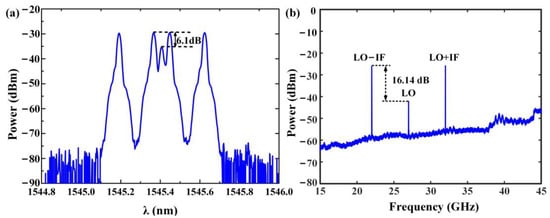 A proof-of-concept experiment was carried out to verify the feasibility of the proposed scheme. In the experiment, a DFB-LD (Innovoton, INNO9303-220M, Chongqing, China) at 1545.43 nm and with an output optical power of 16 dBm was used to generate the optical carrier. A DP-DPMZM (Fujitsu, FTM7977HQ, Kawasaki, Japan) with a 3 dB modulation bandwidth of 23 GHz and an RF half-wave voltage of 3.5 V was employed to load the IF/RF and LO signals onto the optical carrier. Thereinto, the IF/RF signal and the LO signal were equally divided by using an electrical power splitter (Talent Microwave, RS2W10400-K, Suzhou, China) with an operation bandwidth from 1 GHz to 40 GHz and an electrical 90° HC (Marki Microwave, QH-0440, Morgan Hill, CA, USA) with an operation bandwidth from 4 GHz to 40 GHz, respectively. Three DC voltage-stabilized power supplies (RIGOL, DP832A, Suzhou, China) with voltage tuning accuracy of 1 mV were used to precisely control the DC bias voltages of the DP-DPMZM. A spool of SMF with a GVD coefficient of −23 ps2/km at 1550 nm and a length of 20 km was adopted to distribute the optically carried signal. In addition, an erbium-doped optical fiber amplifier (EDFA, Amonics, AEDFA-PA-35-B-FA, Hong Kong, China) and a tunable optical bandpass filter (OBPF, Santec, OTF-350-W-S-FC-A, Komaki, Japan) were used after the fiber transmission to compensate for the fiber link loss and to suppress the out-of-band amplified spontaneous emission (ASE) noise from the EDFA. By tuning the gain of the EDFA, the input optical power of the PD (Discovery, DSC-10H, Marlboro, NJ, USA) was maintained at 5 dBm, where the PD has a 3 dB bandwidth of 40 GHz and a responsivity of 0.6 A/W. The spectra of the optically carried signals and the frequency-converted signals were measured by using an optical spectrum analyzer (OSA, Yokogawa, AQ6370D, Tokyo, Japan) and an electrical spectrum analyzer (ESA, R&S, FSW67, Munich, Germany), respectively.