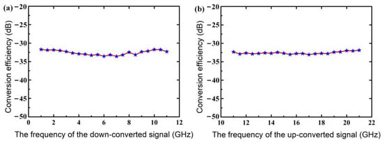 Figure 3a shows the conversion efficiency of the microwave photonic mixer working in the down-conversion mode, where the RF signals in the range of 9 GHz to 19 GHz are down-converted to the range of 1 GHz to 11 GHz by using an LO signal at 8 GHz. Figure 3b presents the conversion efficiency of the microwave photonic mixer working in the up-conversion mode, where an IF signal at 5 GHz is up-converted to the range of 11 GHz to 21 GHz by using the LO signals in the range of 6 GHz to 16 GHz. It can be seen from Figure 3 that the conversion efficiency of the microwave photonic mixer is −32.69 ± 0.91 dB and −32.44 ± 0.63 dB for the down-conversion mode and the up-conversion mode, respectively. The frequency conversion efficiency can be further improved by using a high-power DFB-LD, a DP-DPMZM with a low half-wave voltage and a low insertion loss, and a PD with high optical power handling capability.