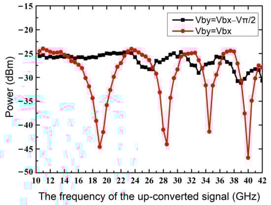 Equation (5) indicates that the input IF/RF signal at ωs is converted to |ωLO + ωs| and |ωLO − ωs| through frequency mixing with the LO signal at ωLO. The phase shift of the frequency-converted signals at |ωLO + ωs| and |ωLO − ωs| can be tuned through synchronously adjusting the DC bias voltages, VbX and VbY. Since both VbX and VbY can be adjusted from 0 to 2 Vπ0, and the phase shift of the frequency-converted signals at |ωLO + ωs| and |ωLO − ωs| can be tuned within a range of 360°. In addition, it can be seen from Equation (5) that there is no dispersion-induced power fading of the frequency-converted signals at |ωLO + ωs| and |ωLO − ωs| if the relationship of φY = φX − π/2 is maintained during the phase tuning.