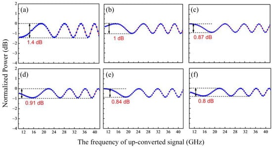 The extinction ratios of the parent-MZM and the sub-MZMs in the DP-DPMZM were measured to be 22 dB and 20 dB, respectively. The maximum bias-voltage deviations of the four sub-MZMs in the DP-DPMZM were measured to be 7%, 4%, 14% and 4%, respectively. In addition, the frequency response of the PS and the 90° HC were measured by using a vector network analyzer (VNA, R&S, ZNA67, Munich, Germany), where the maximum phase deviation and amplitude imbalance are ±6° and ±0.4 dB for the PS, and ±5° and ±0.4 dB for the HC. Thereinto, the amplitude imbalance of ±0.4 dB corresponds to a power imbalance ratio of 0.45 to 0.55. Figure 5a–f show the frequency response of the microwave photonic mixer obtained by carrying out numerical calculation with one parameter deviation under the worst cases and all other parameters holding at ideal levels, respectively. It can be seen from Figure 5 that, although the frequency-dependent power fading induced by independent parameter deviation is small, the combined effect together with the influence of the frequency response introduced by the DP-DPMZM, the PD and the cables is obvious, as depicted in Figure 4. Hence, it is critically important to select devices with large bandwidths and small parameter deviations to enhance the frequency-response flatness of the microwave photonic mixer with long-distance fiber transmission. In addition, the vestigial frequency-dependent power fading of Figure 4 is repeatable, and it can be compensated by increasing the power of the LO signal.