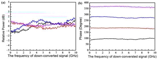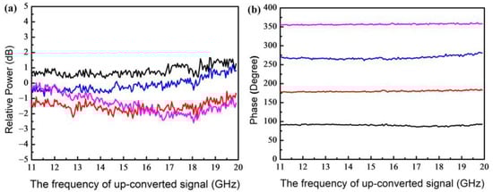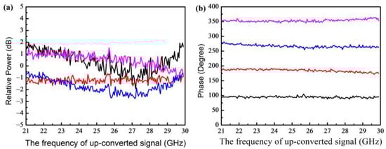 Four phase-shift values with a step of 90° are preset in the measurement. Figure 7a,b present the power response and the phase response of the microwave photonic mixer working in the down-conversion mode, respectively, where the RF signals in the range of 10.1 GHz to 19.9 GHz are down-converted to the range of 0.1 GHz to 9.9 GHz by using an LO signal at 10 GHz. Figure 8a,b exhibit the power response and the phase response of the microwave photonic mixer working in the up-conversion mode, respectively, where the IF signals in the range of 1 GHz to 9.9 GHz are up-converted to the range of 11 GHz to 19.9 GHz by using an LO signal at 10 GHz. Figure 9a,b show the power response and the phase response of the microwave photonic mixer working in the up-conversion mode, respectively, where the IF signals in the range of 1 GHz to 9.9 GHz are up-converted to the range of 21 GHz to 29.9 GHz by using an LO signal at 20 GHz. These results indicate that the proposed microwave photonic mixer can achieve a broadband phase-shift tuning without obvious power variation even after long-distance fiber transmission. Finally, it should be pointed out that the phase-shift-tuning range can be enlarged beyond 360° through synchronously tuning VbX and VbY over a range larger than 2 Vπ0. In addition, the bandwidth of the continuously adjustable phase shift can be further improved by using a DP-DPMZM with a larger analog bandwidth.