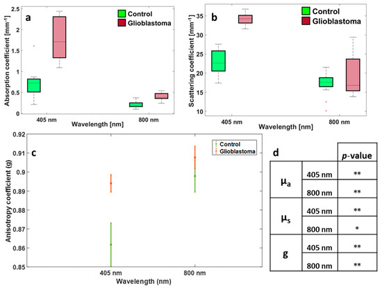 Distribution of absorption (a), scattering (b), and anisotropy coefficients (c) for the control and tumorous tissues using 405 and 800 nm excitation wavelengths, (d) summary table of p-values obtained by realizing a student for control vs. GBM for each parameter and for each wavelength; **: indicates that p-value < 0.05; *: indicates that p-value > 0.05.